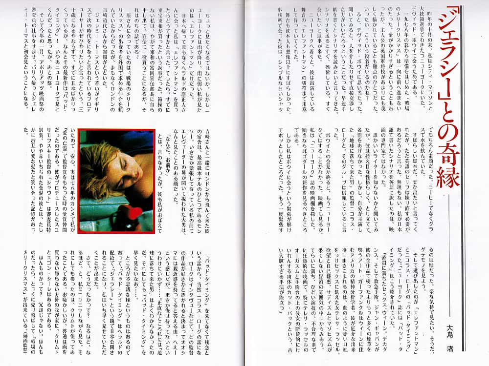 これは、ニコラス・ローグ監督の「ジェラシー」(原題:BAD TIMING/1980年)という映画のパンフレットに掲載されていた映画監督・大島渚の寄稿で、後にセリアズを演じたデヴィッド・ボウイや、プロデューサーのジェレミー・トーマスと初めて会った時のエピソード等が紹介されている。
